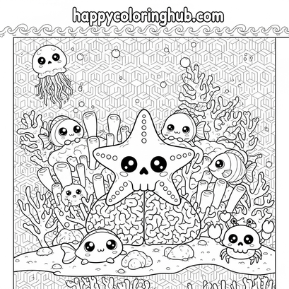 Unwind with our “Creepy Kawaii Coral Reefs” coloring page! This unique design blends cute Japanese aesthetics with slightly spooky ocean life. Perfect for women seeking a relaxing and creatively fulfilling activity. Download and print instantly for hours of detailed coloring fun. Explore the depths of creepy kawaii! #creepykawaii #coloringpage #coralreef #coloringforadults #women #kawaiiart #printable