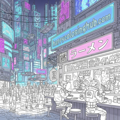 Unleash your inner artist with our Cyberpunk Ramen Coloring Page for Men! Dive into a gritty, neon-lit world where delicious ramen meets futuristic tech. Perfect for relaxation and creative expression, this intricate design offers a unique coloring experience. Download your Cyberpunk Ramen coloring page today and add your own vibrant touch to this dystopian delicacy. #cyberpunk #ramen #coloringpages #men #art #coloring #download #printable