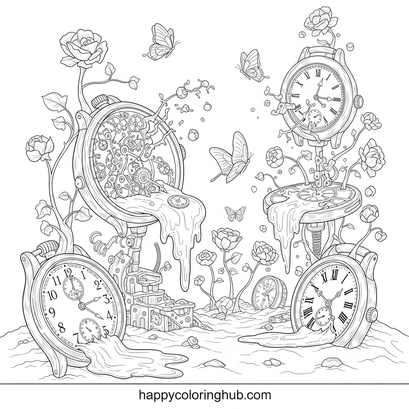 Unleash your creativity with our detailed surreal watches coloring page! Download and print this intricate design featuring melting clocks, impossible gears, and dreamlike details. Perfect for adults and teens seeking a relaxing and imaginative coloring experience. Escape reality, reduce stress, and create your own unique masterpiece. Get your free coloring page now and let your imagination tick! #coloringpage #surrealart #watches #adultcoloring #freecoloring #arttherapy #printable.