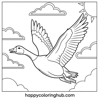 Unleash creativity with our Goose Flying Coloring Page! Download and print this engaging design for hours of relaxing fun. Perfect for kids and adults, coloring promotes mindfulness, reduces stress, and improves focus. Our goose in flight provides a captivating scene to experiment with colors and develop fine motor skills. Ignite your imagination and bring this majestic bird to life. Free and easy to access, start coloring your goose masterpiece today! A great activity for bird lovers and art enthusiasts.