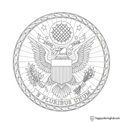 Unleash your patriotic creativity with our Great Seal of the USA coloring page! Download and print this iconic symbol of American history. Perfect for kids and adults, coloring offers a fun, relaxing way to learn about the United States. Improve focus, reduce stress, and enhance fine motor skills while exploring the symbolism of the bald eagle, olive branch, and arrows. Get your Great Seal coloring page today and add your personal artistic touch to this enduring emblem of freedom! Great for educational activities and creative fun.